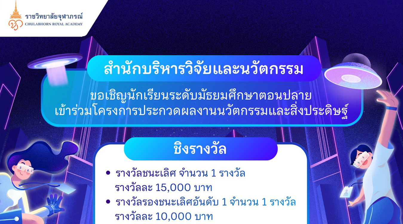 สำนักบริหารวิจัยและนวัตกรรม วิทยาลัยวิทยาศาสตร์การแพทย์เจ้าฟ้าจุฬาภรณ์ ราชวิทยาลัยจุฬาภรณ์ ขอเชิญชวนนักเรียนระดับชั้นมัธยมศึกษาปลาย เข้าร่วมโครงการประกวดผลงานนวัตกรรมและสิ่งประดิษฐ์ ภายใต้หัวข้อ “นวัตกรรม/สิ่งประดิษฐ์ด้านวิทยาศาสตร์สุขภาพ” โอกาสสำคัญในการแสดงศักยภาพ ฝึกทักษะการคิดเชิงนวัตกรรม และก้าวแรกสู่เส้นทางสายวิทยาศาสตร์สุขภาพในอนาคต